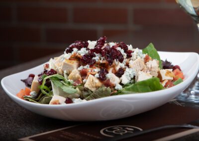 Greens topped with grilled chicken, AmaBlu® crumbles, tomatoes, bacon, and dried cranberries. Served with raspberry vinaigrette. (GF) 16.99