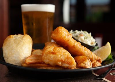 For kids under 12 and our friends over 55. Served with choice of Pub Fries, Pub Chips, Coleslaw or Mandarin Oranges.